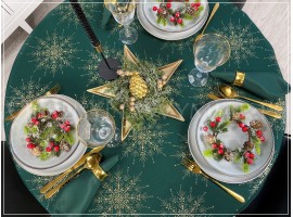 Elegancki świąteczny obrus wykończony dekoracyjną złotą lamówką.
