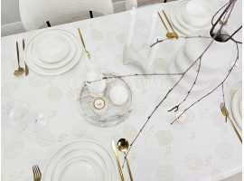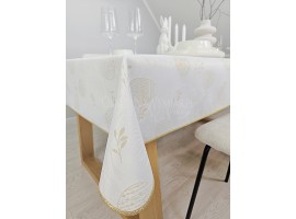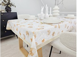 Elegancki świąteczny obrus z delikatnym wzorem w złote pisanki i bazie.
