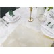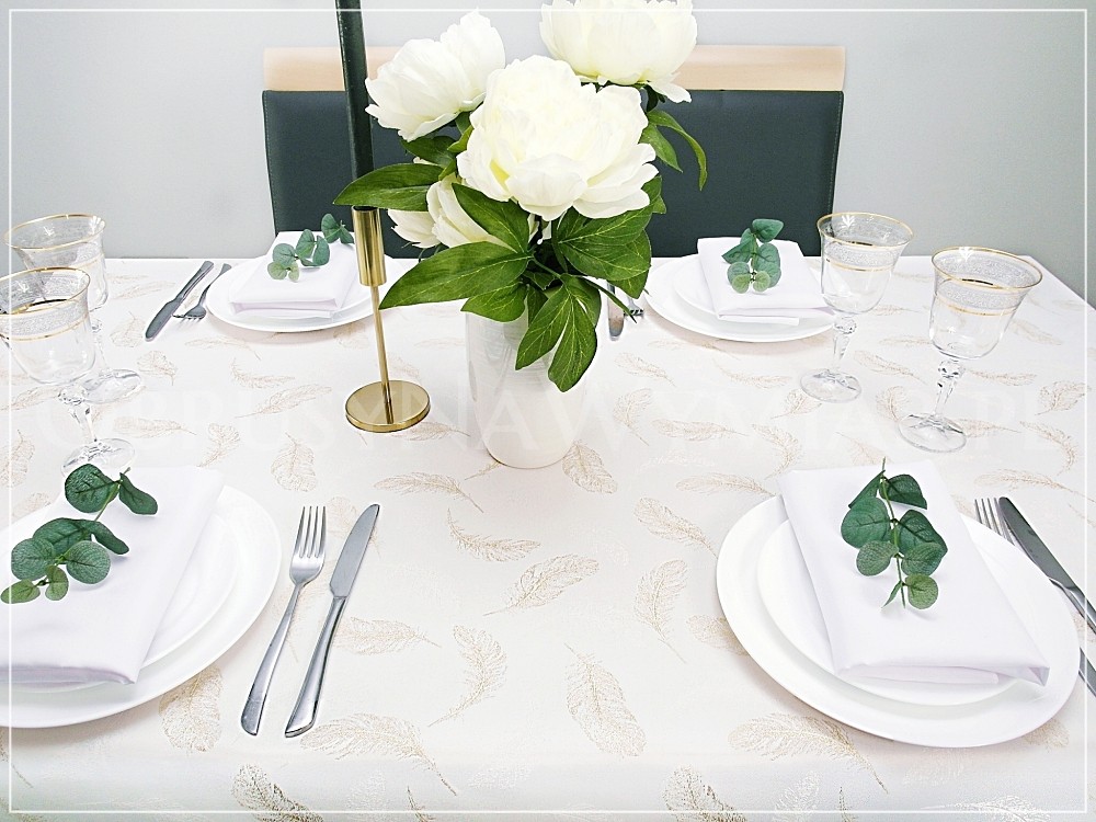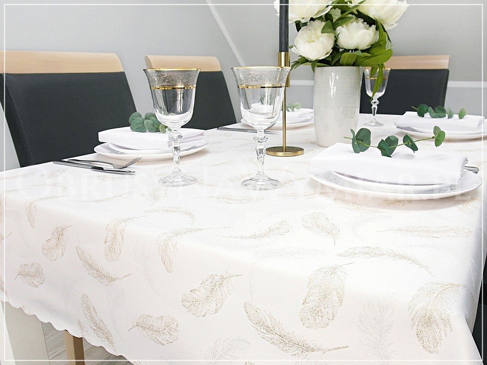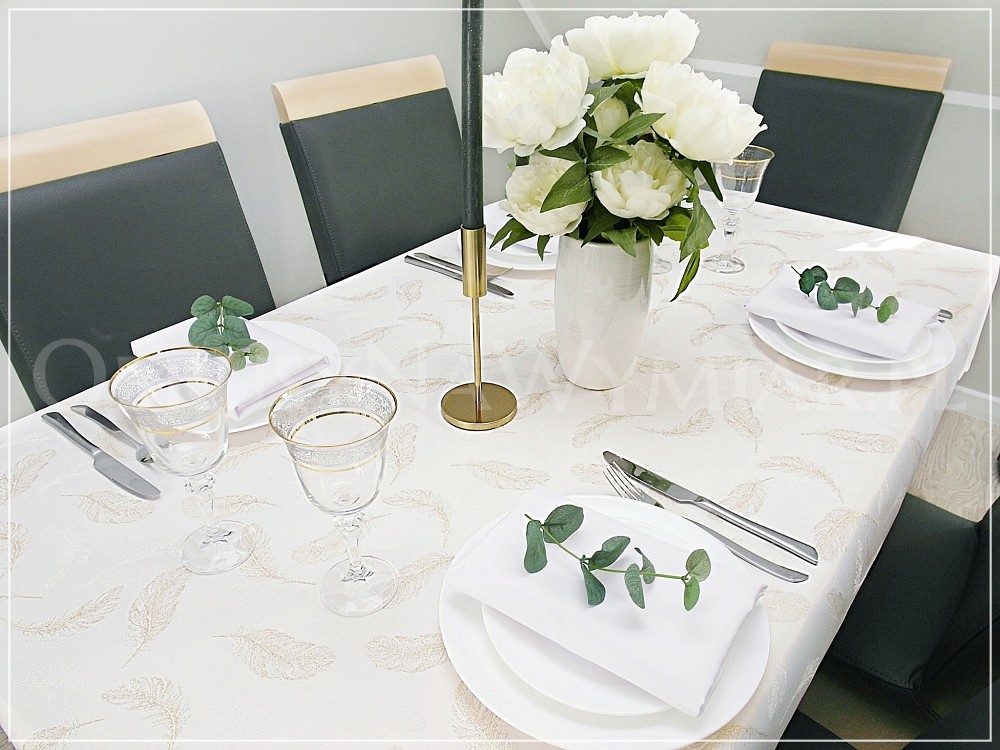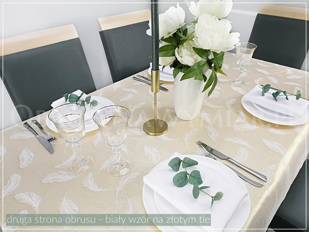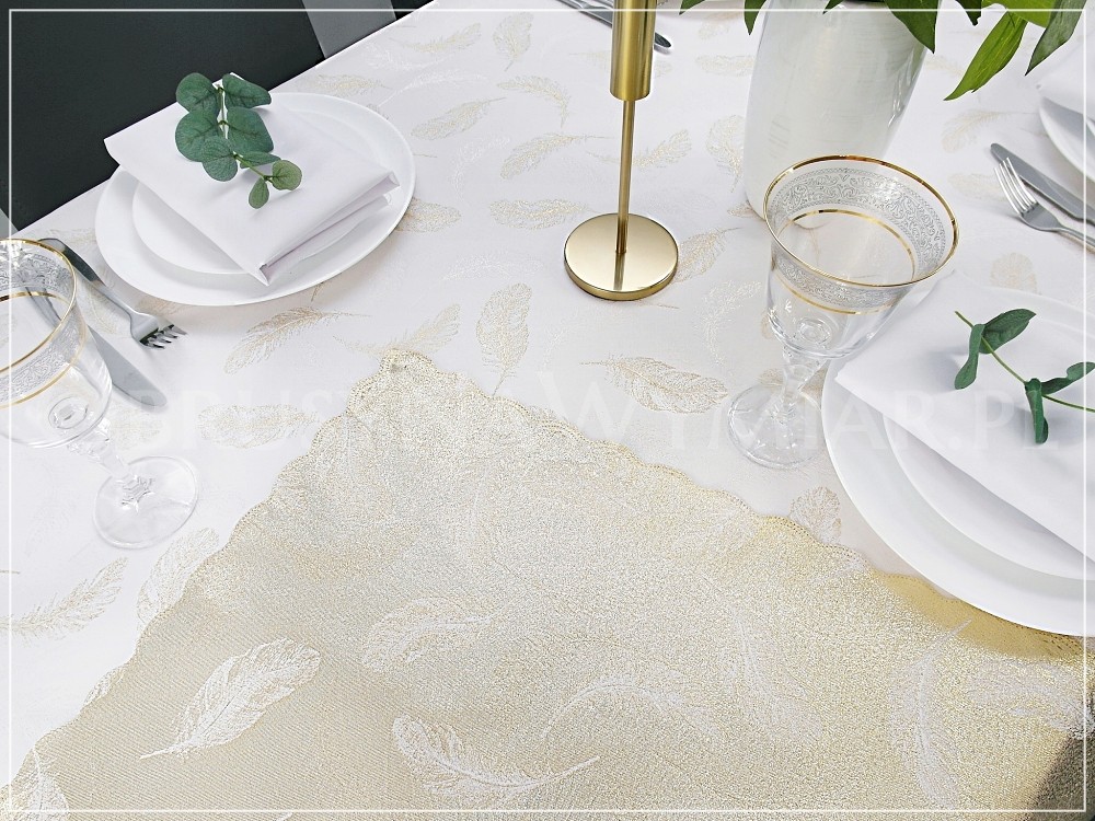 Wzór tkaniny to delikatne złote piórka na białym matowym tle(złamana biel z uwagi na lewą stronę obrusu, która jest złota). Wzór pięknie się błyszczy dzięki metalizowanej nici. Druga strona obrusu jest złota w białe piórka.