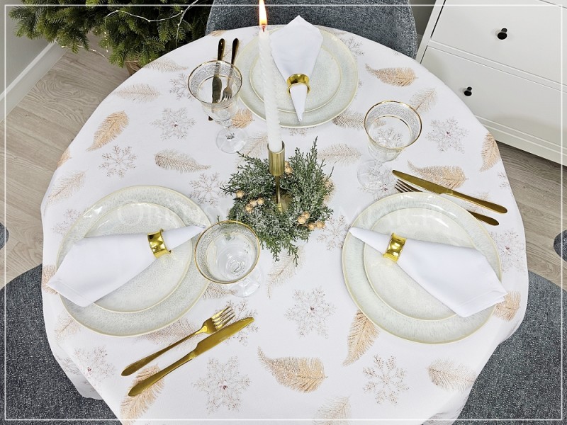 Bazą obrusu FROZEN jest białe tło, które zdobią śnieżynki, płatki śniegu a także piórka, które nadają oryginalności i charakteru.