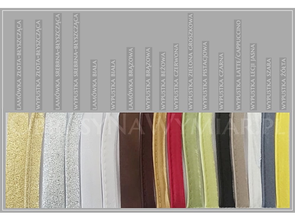 Kolory wypustki do wyboru: biały, ecri jasny, pistacjowy, zielony groszkowy, żółty, beżowy, latte, złoty błyszczący, srebrny błyszczący, szary, czarny lub czerwony.