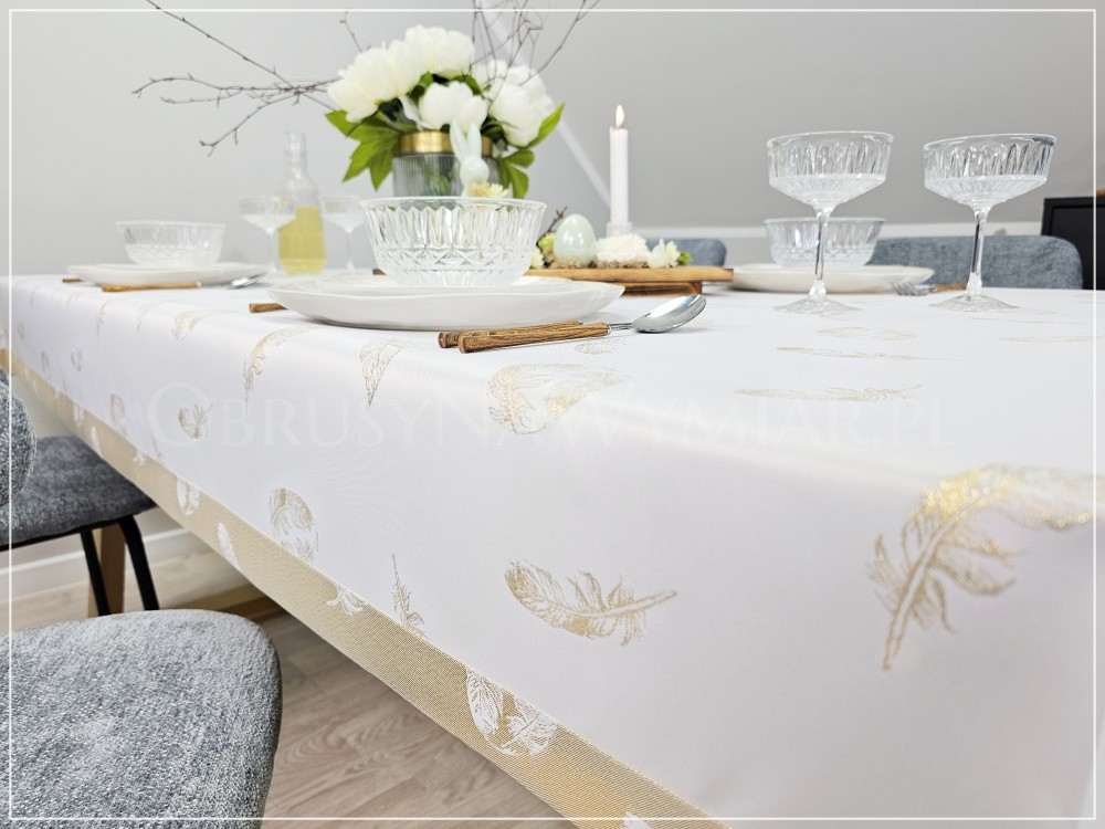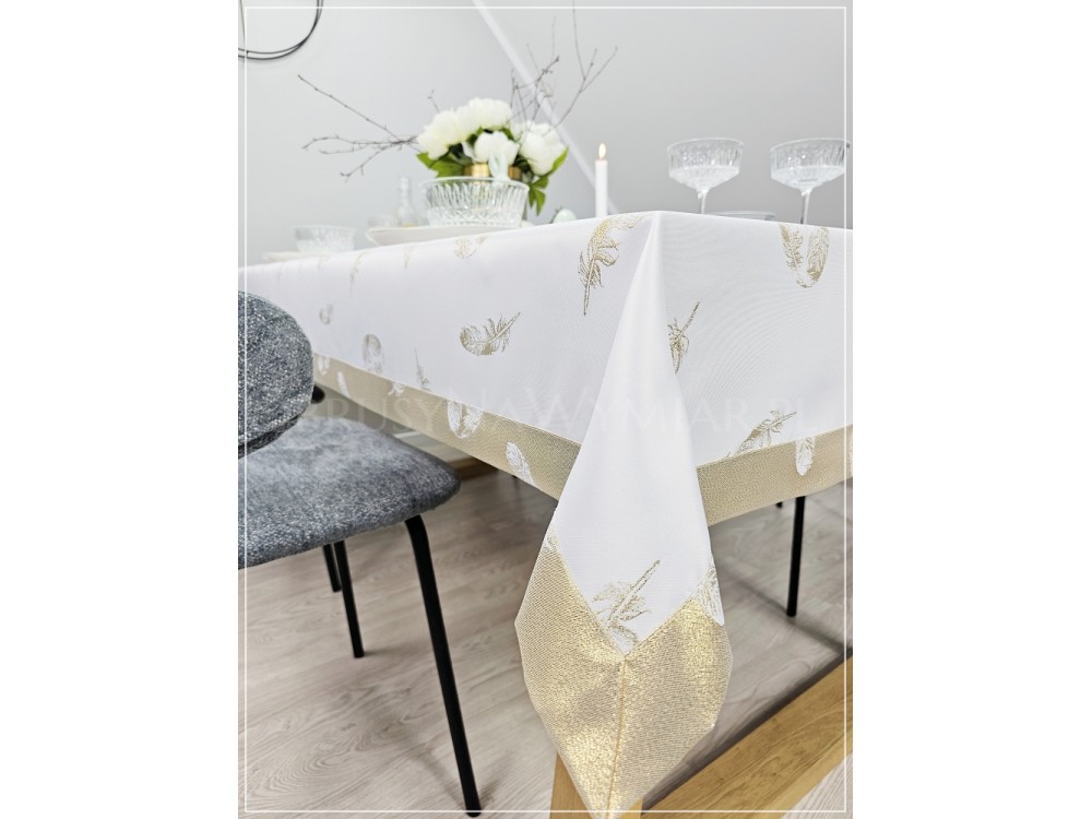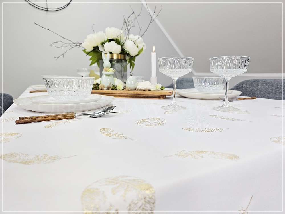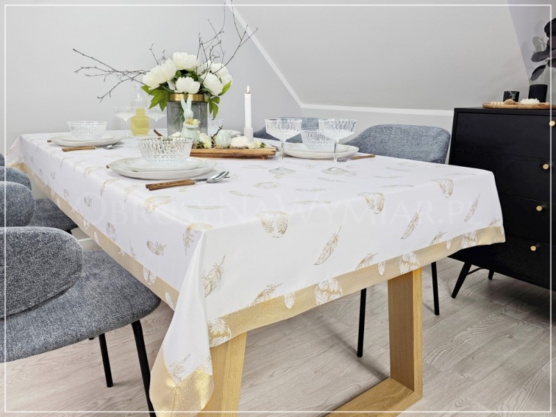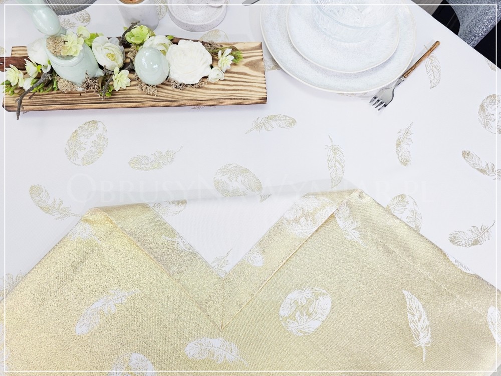 Wzór tkaniny to delikatne złote piórka oraz złote pisanki wielkanocne, które zostały ozdobione również piórkami. Zarówno pisanki jak i piórka mają około 8-9cm wielkości. Lewa strona obrusu jest złota z białym wzorem.