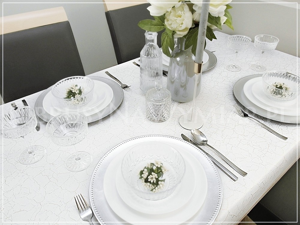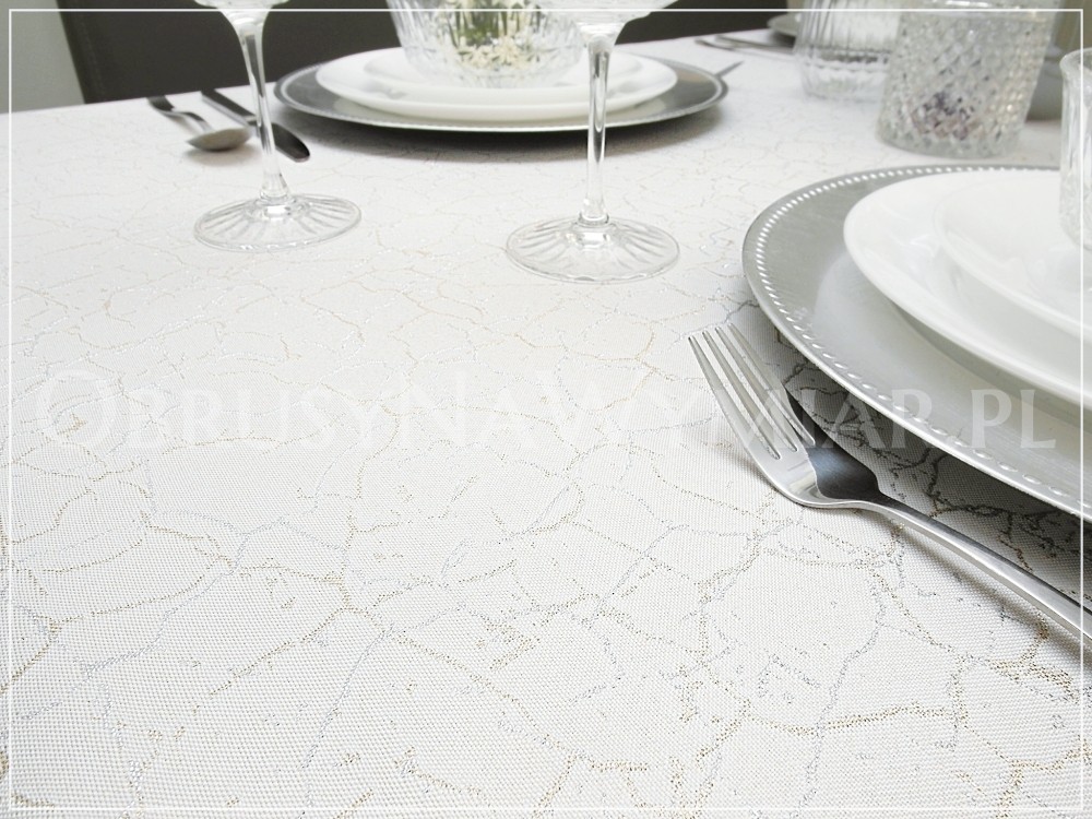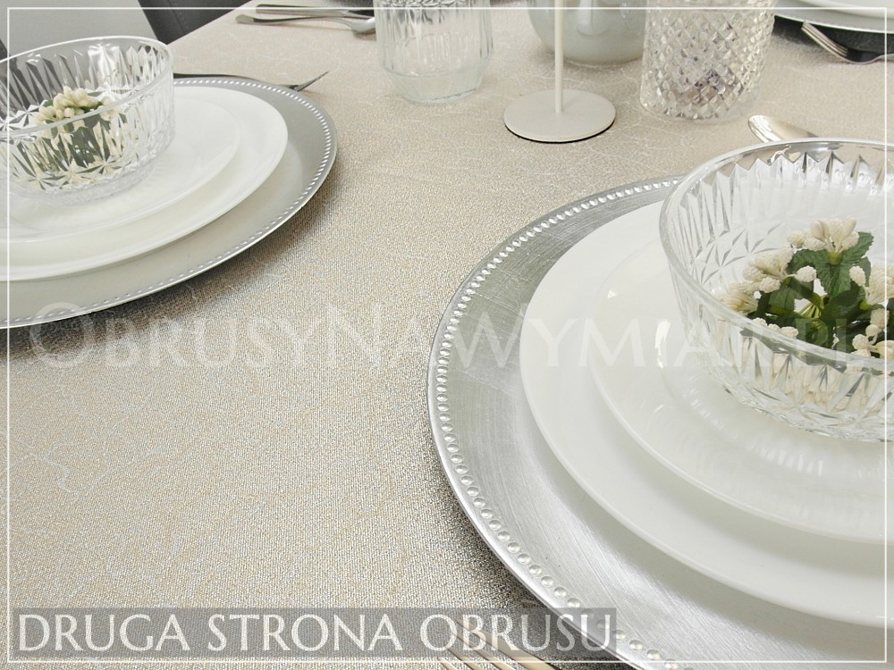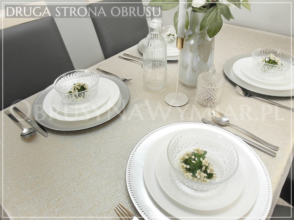 Wzór tkaniny to srebrno-złoty wzór na kształt marmuru na białym tle. Złoto jest delikatne nie żółte, lecz szampańskie. Natomiast lewa strona obrusu jest w kolorze szampańskiego złota z delikatnym marmurkowym wzorem, co widać na ostatnich zdjęciach.