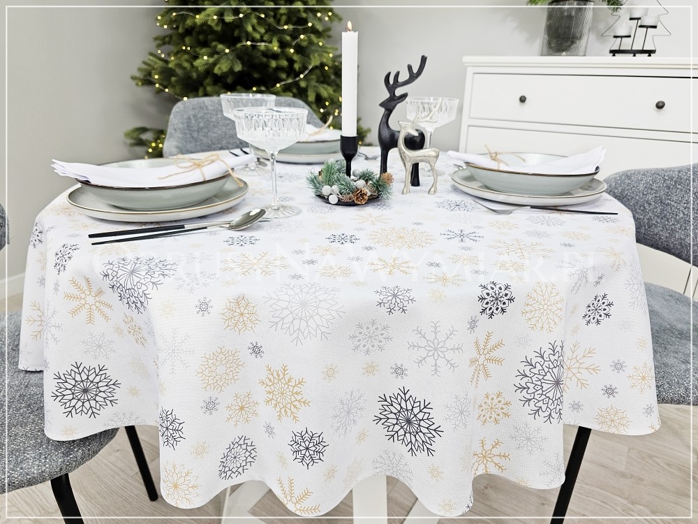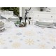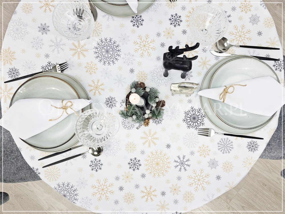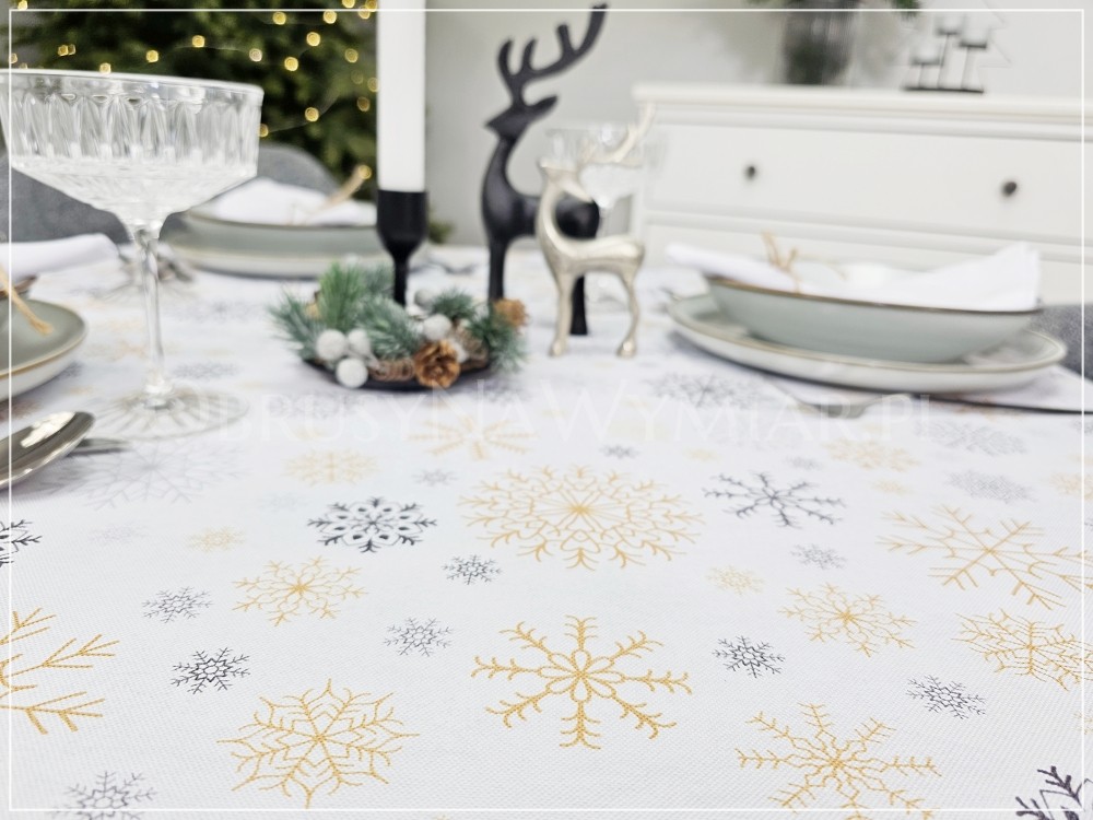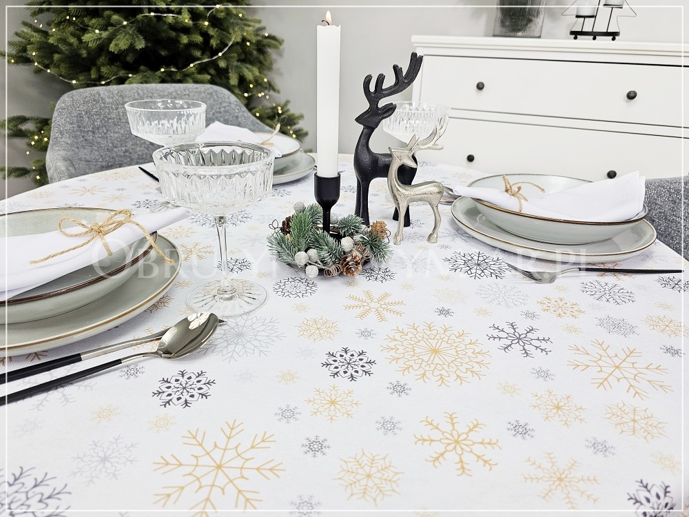 Bazą obrusu MROZIK jest białe tło, które zdobią delikatne śnieżynki. Śnieżynki są różnej wielkości i różnego koloru. Bardzo ciekawe i modne aktualnie połączenie kolorów szarości i beżu.
