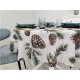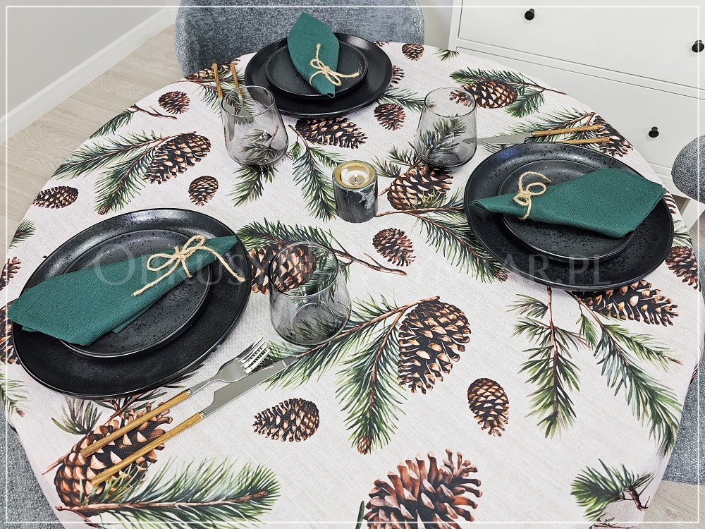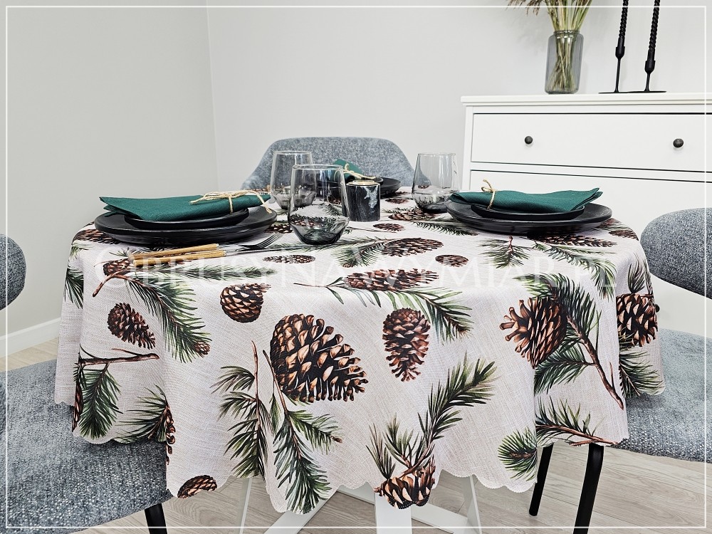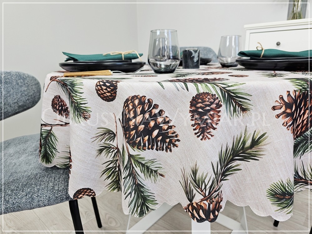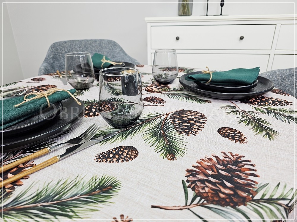 Bazą obrusu SZYSZKI jest beżowo-melanżowe tło, które wygląda bardzo naturalnie. Dopełnieniem naturalnego charakteru jest wzór, który stanowią duże, brązowe szyszki i sosnowe gałązki.