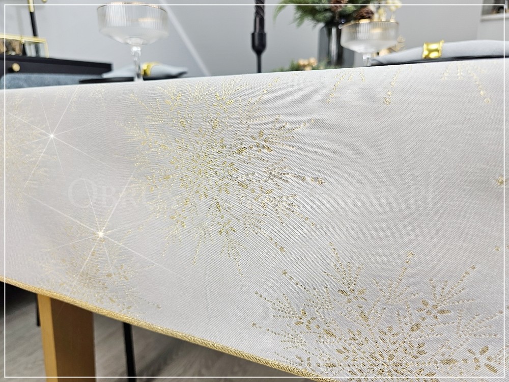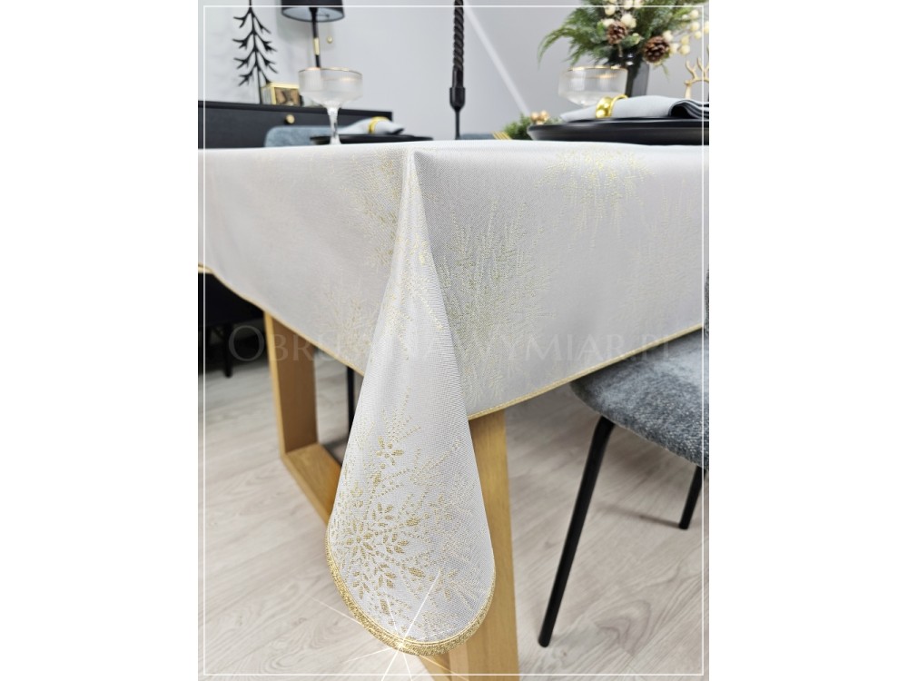 Obrus jest estetycznie wykończony złotą błyszczącą lamówką o szerokości ok. 0,6cm.