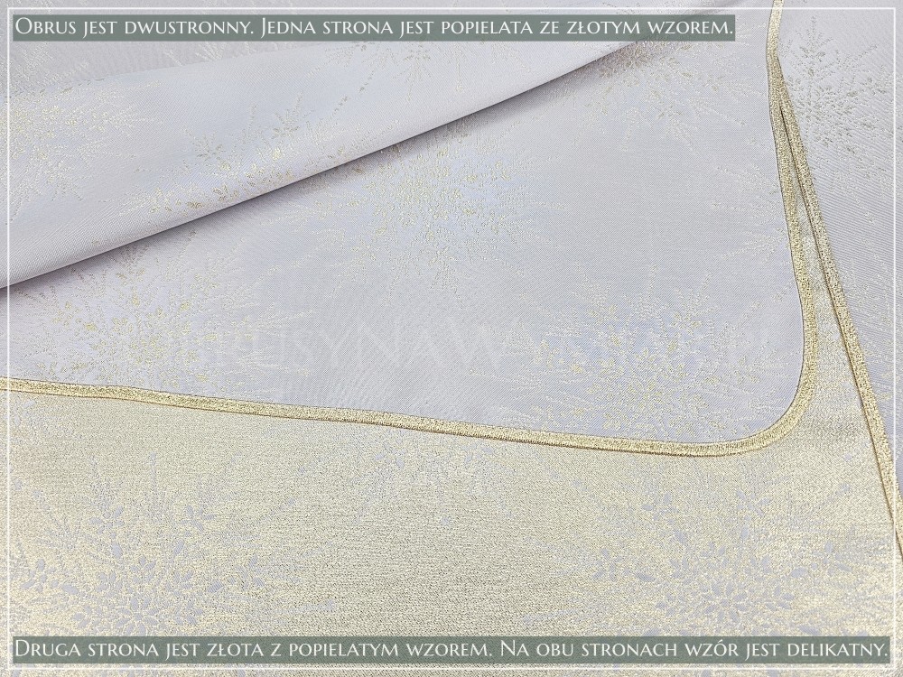 Wzór tkaniny to złote płatki na jasno popielatym tle. Lewa strona obrusu jest złota z jasnym wzorem.