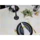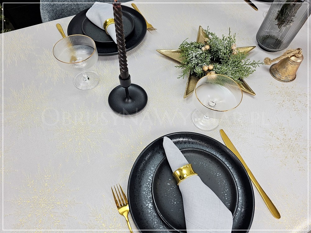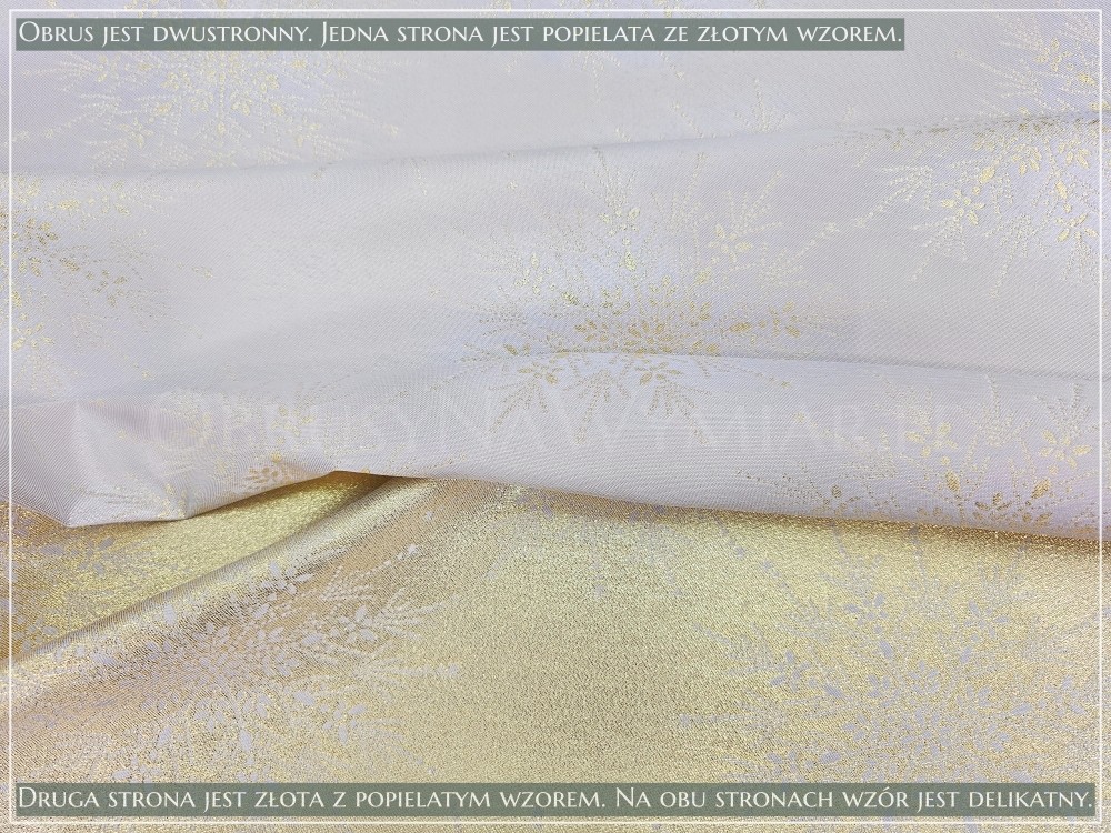 Wzór tkaniny to złote płatki na jasno-popielatym tle. Lewa strona obrusu jest złota z popielatym wzorem.