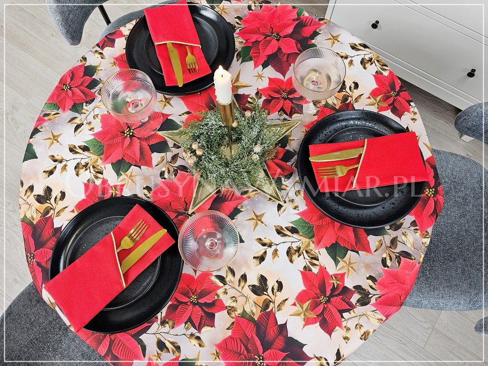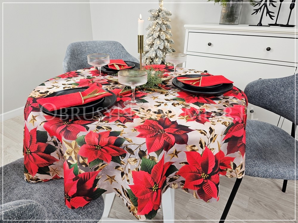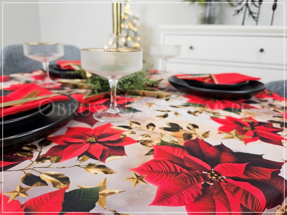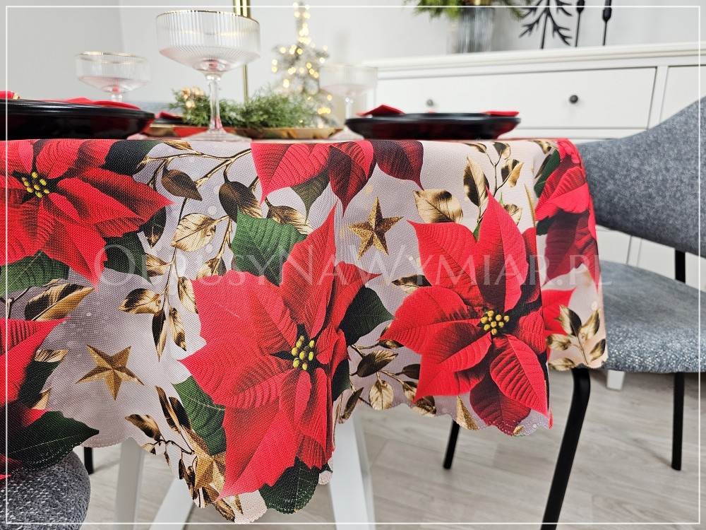 Obrus RED CHRISTMAS pasuje do każdego wnętrza zarówno nowoczesnego jak i klasycznego. Czerwień, złoto i zieleń to kolory, które od zawsze kojarzą się nam ze świętami. Piękne czerwone gwiazdy betlejemskie na obrusie tworzą wyjątkowo świąteczny nastrój we wnętrzu. Wzór obrusu sprawia, że nie potrzeba już wiele dodatków, aby stół był pięknie udekorowany.
