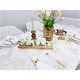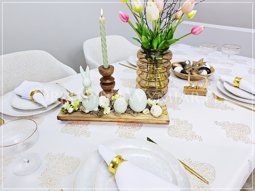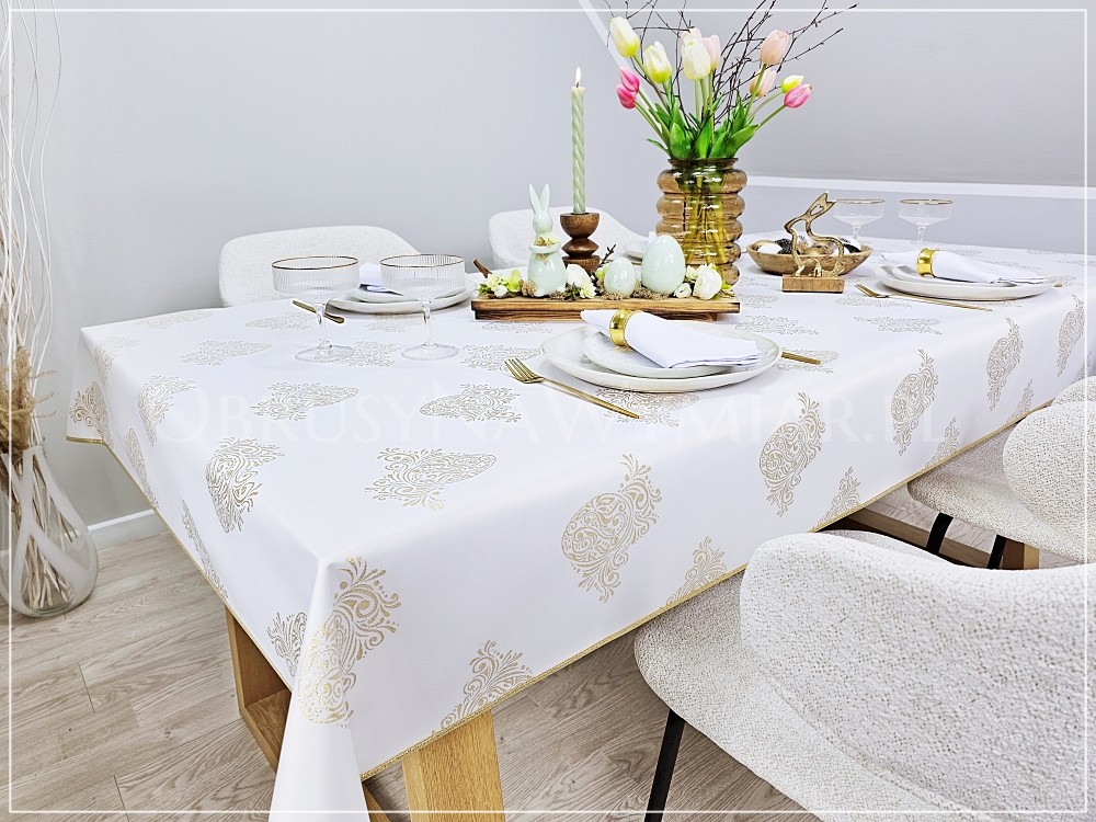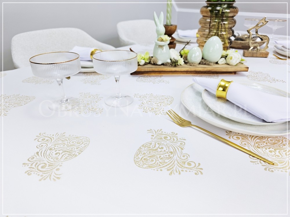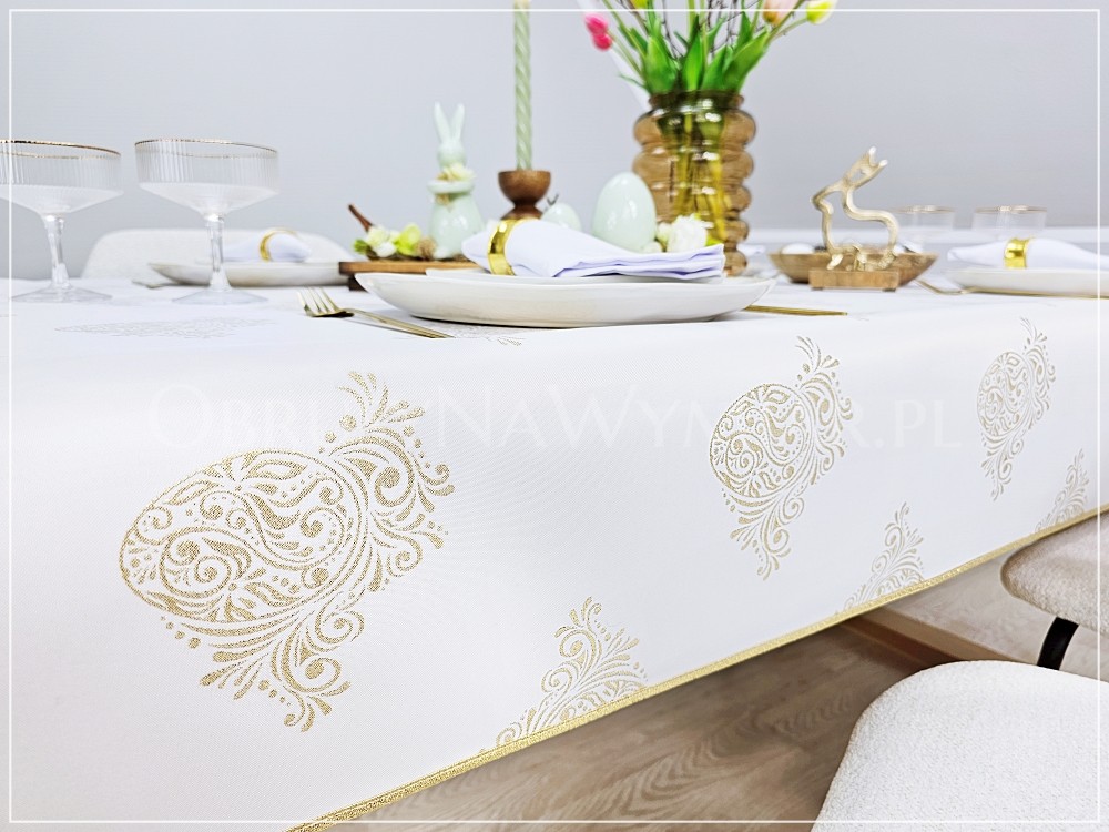 Luksusowy design – subtelny, wielkanocny wzór w odcieniach złota. Wzór tkaniny to delikatne złote pisanki zdobione eleganckim ornamentem. Lewa strona obrusu jest złota z białym wzorem.