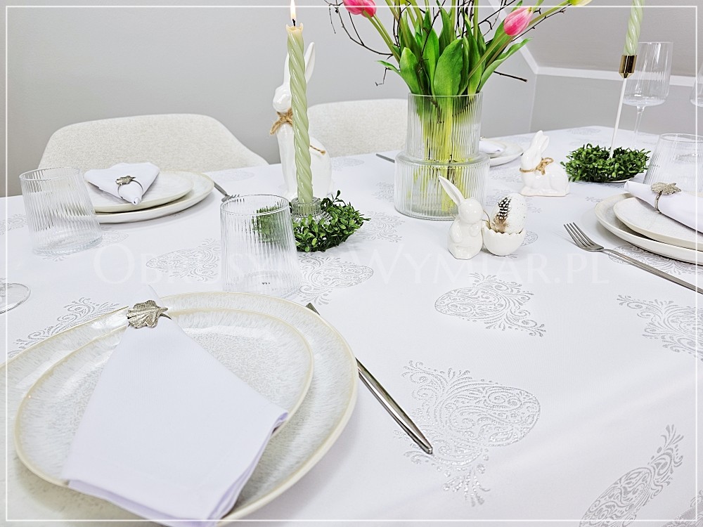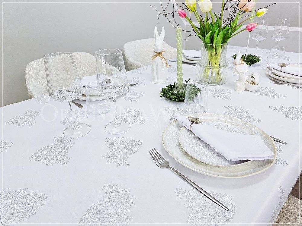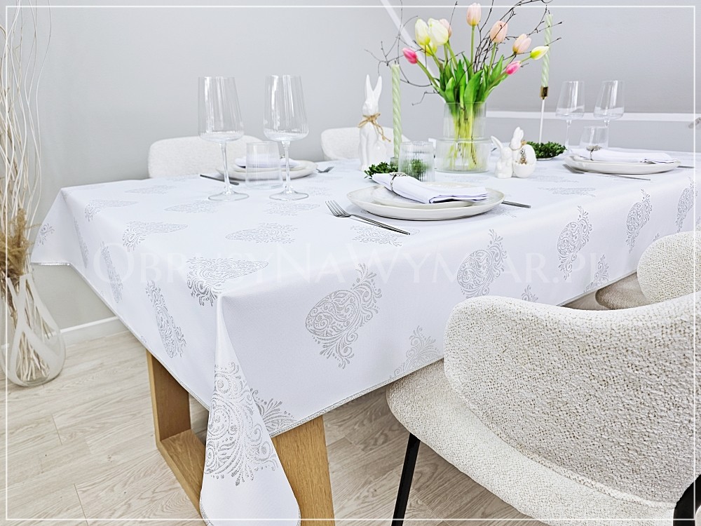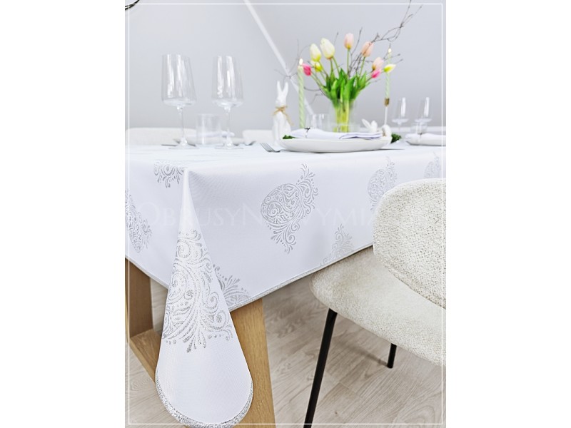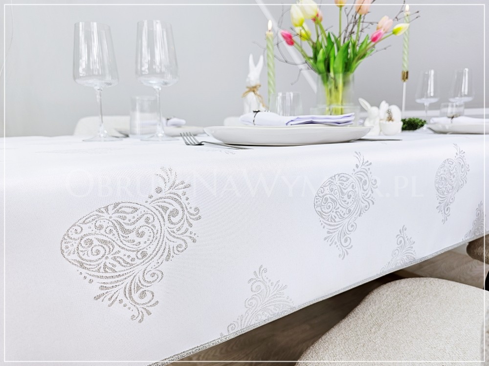 Luksusowy design – subtelny, wielkanocny wzór w odcieniach srebra. Wzór tkaniny to delikatne srebrne pisanki zdobione eleganckim ornamentem. Lewa strona obrusu jest srebrna z białym wzorem.
