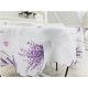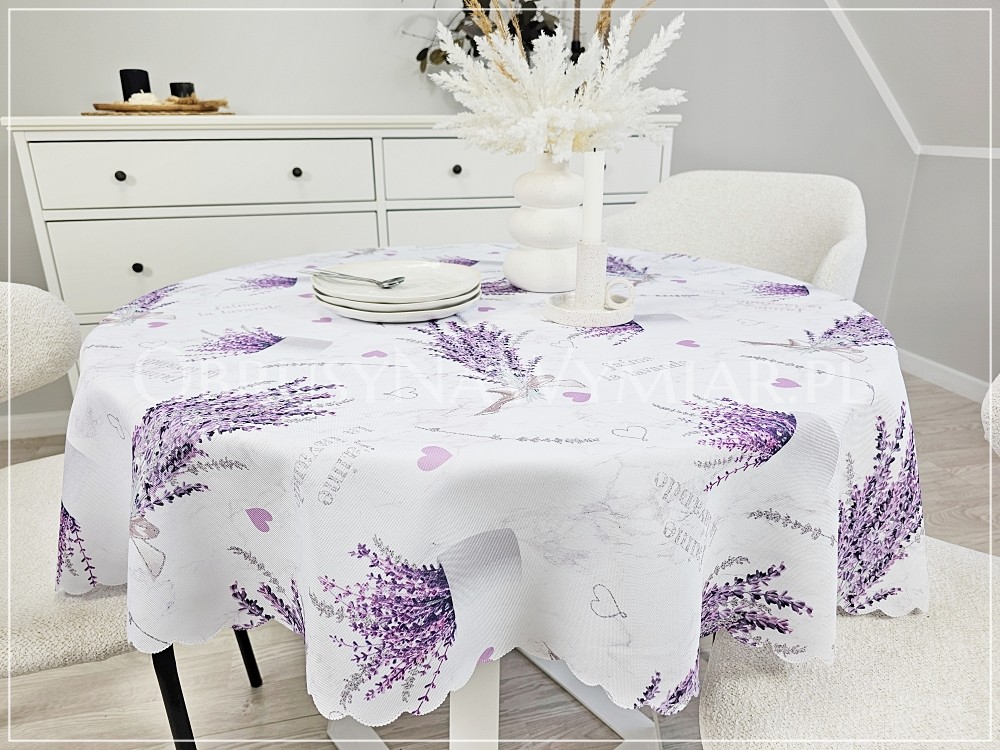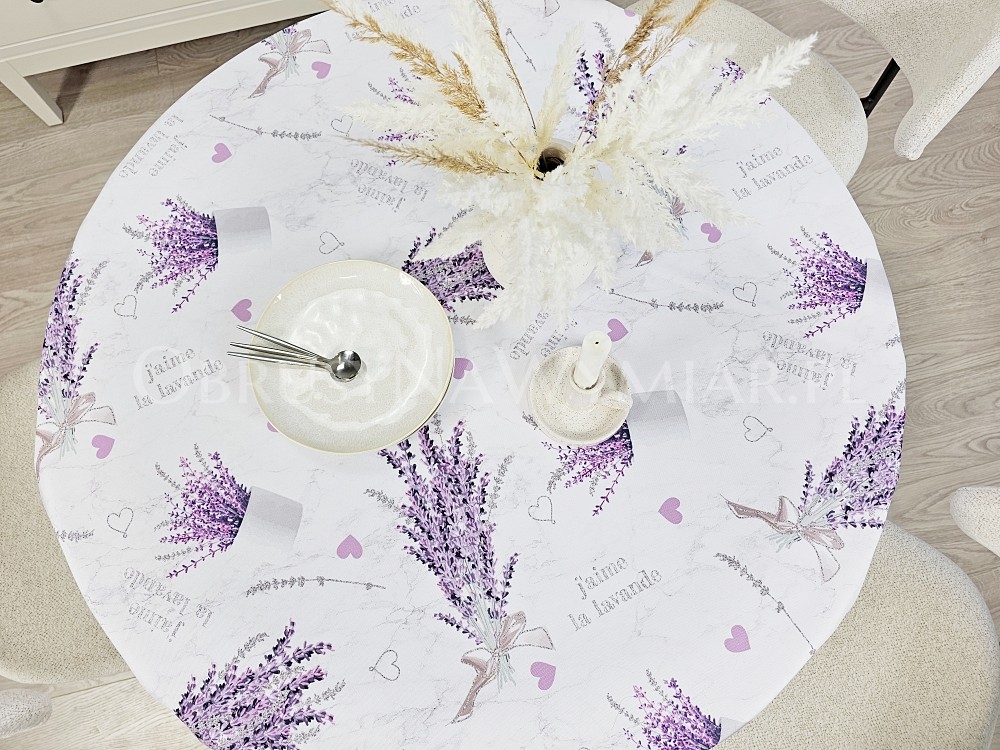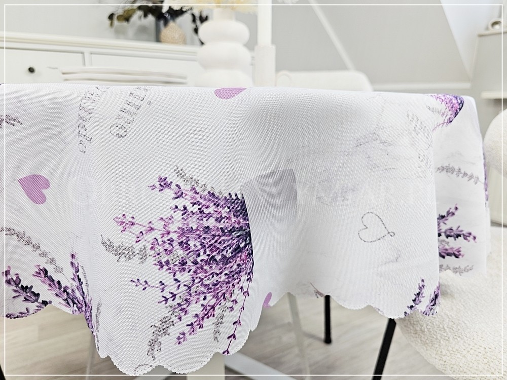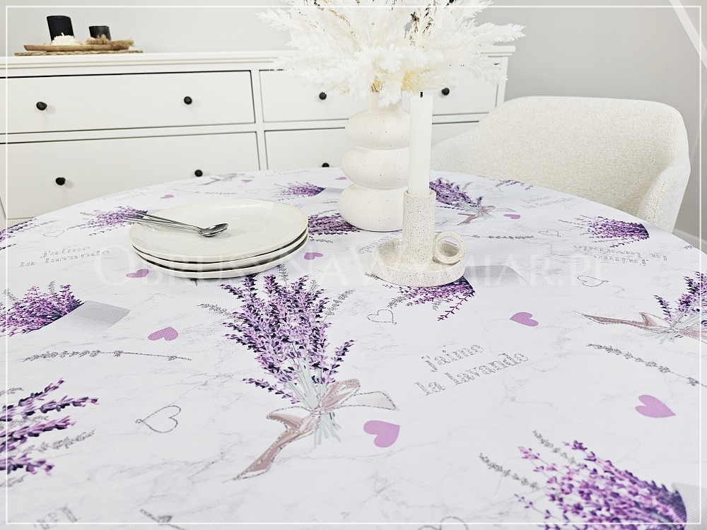 Obrus w prowansalskim stylu inspirowany pięknem lawendowych pól przenosi do malowniczej Francji. Delikatne bukiety lawendy, przewiązane subtelną wstążką, zdobią tkaninę w harmonijnym odcieniu fioletu, tworząc przytulny i elegancki klimat. Elementy dekoracyjne, takie jak serduszka oraz francuski napis J’aime la lavande, podkreślają romantyczny charakter wzoru.