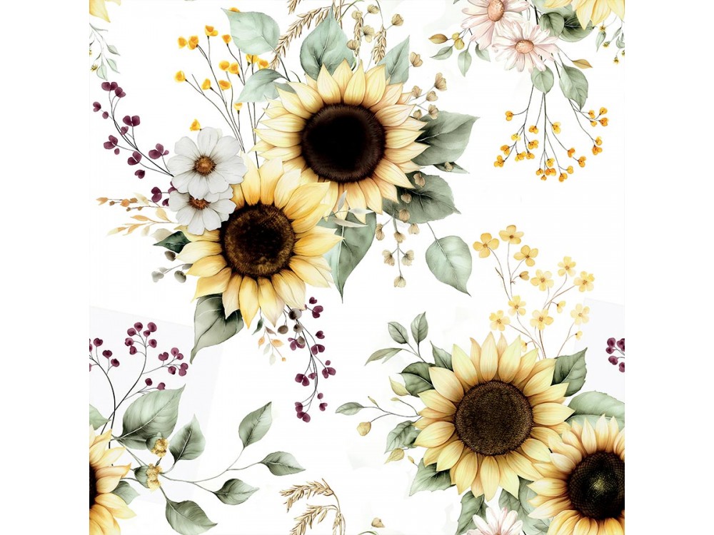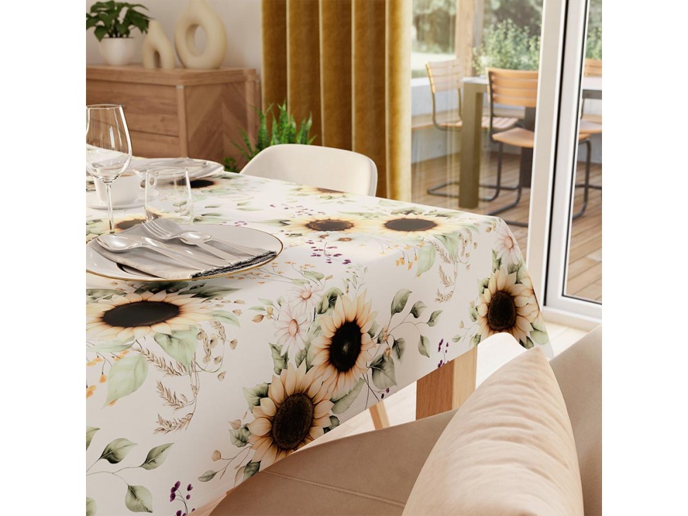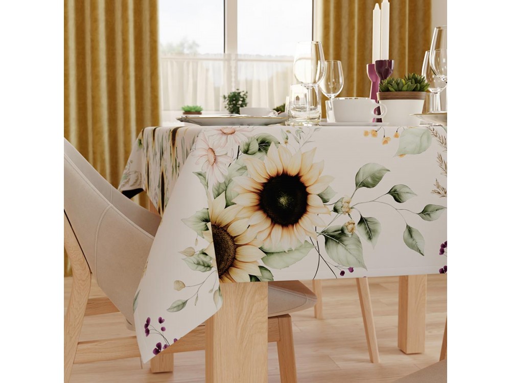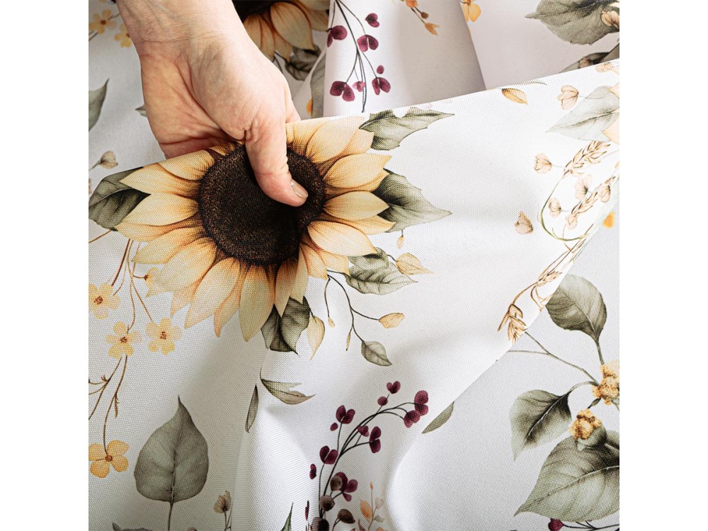 Bazą obrusu jest biel na której widnieją piękne słoneczniki i inne polne kwiaty.