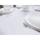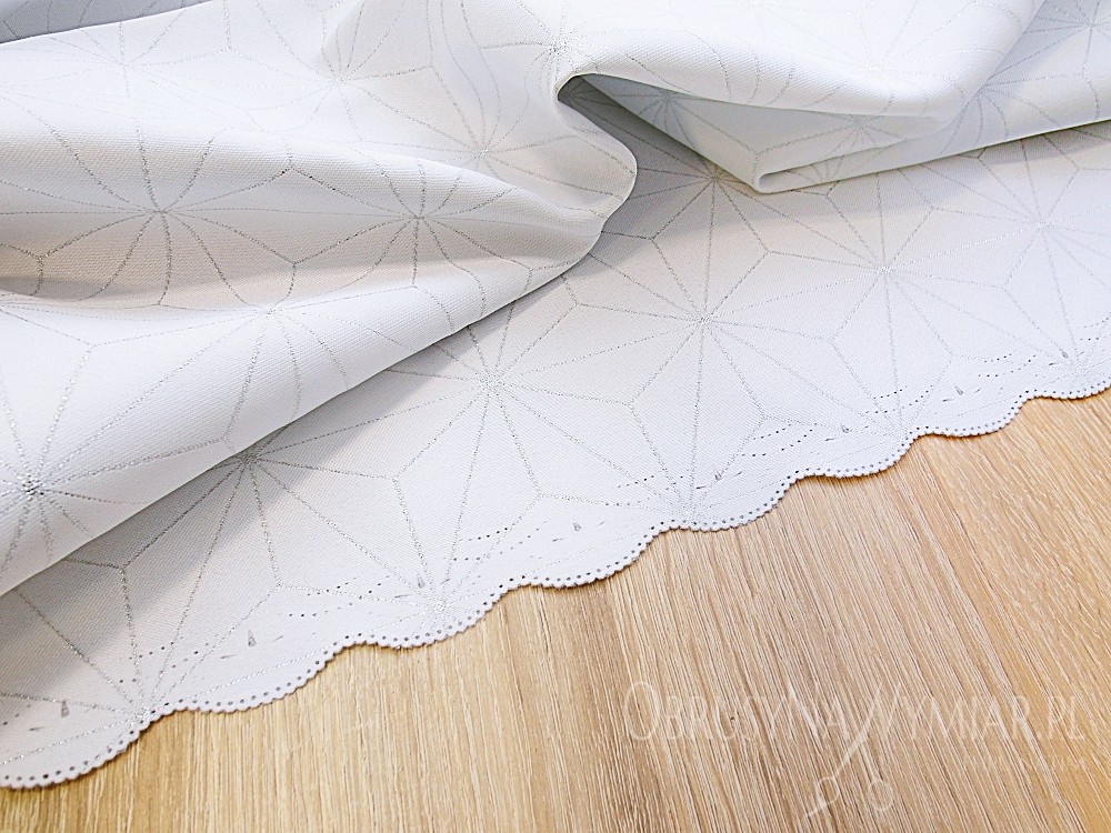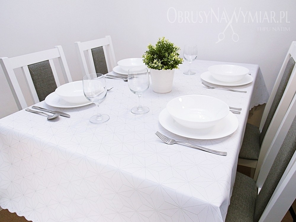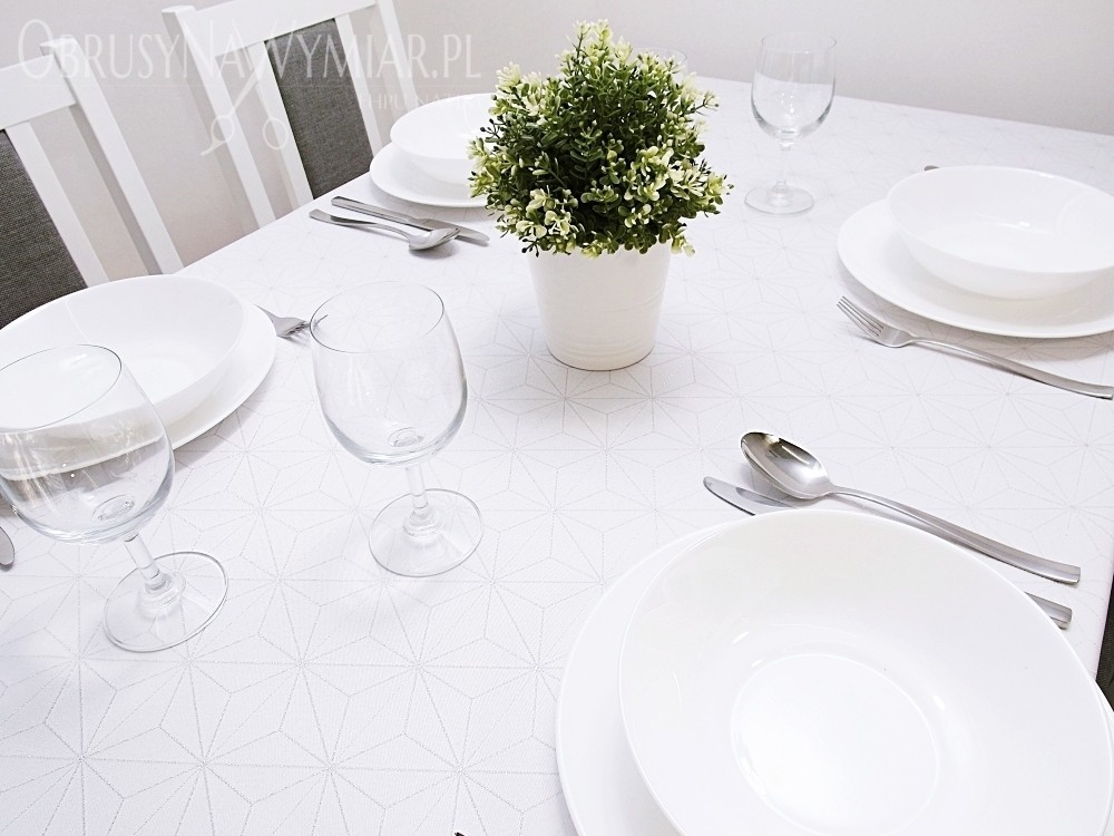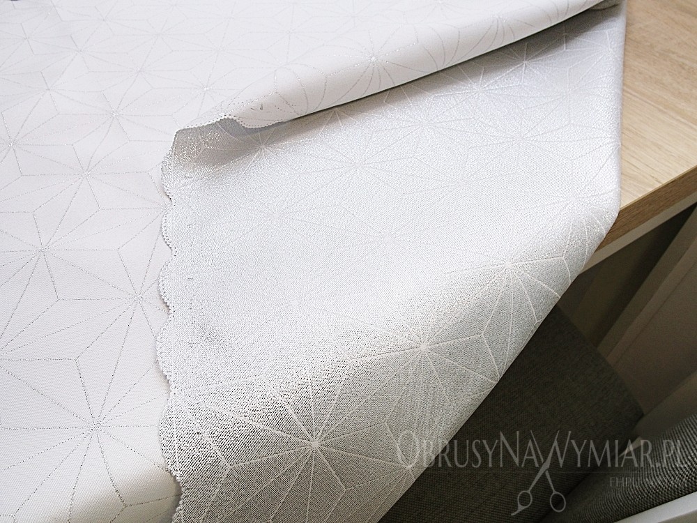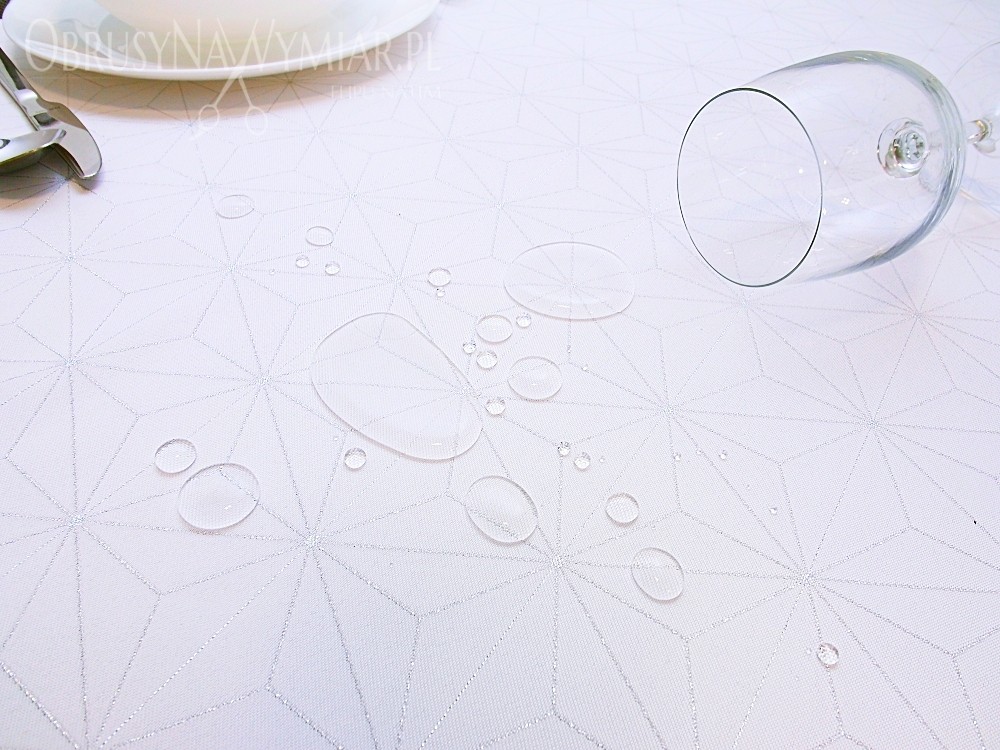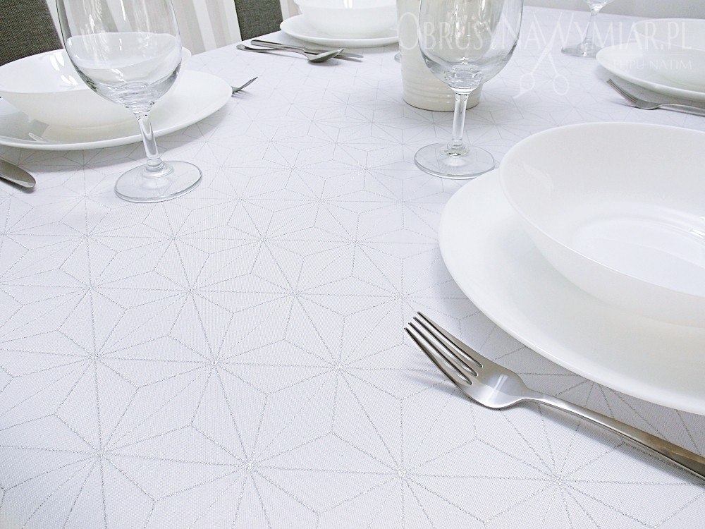 Delikatny geometryczny wzór przypomina diamenty. Wzór jest koloru srebrnego na białym matowym tle. Lewa strona obrusu jest srebrna z białym wzorem.