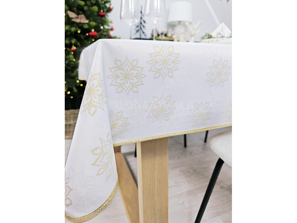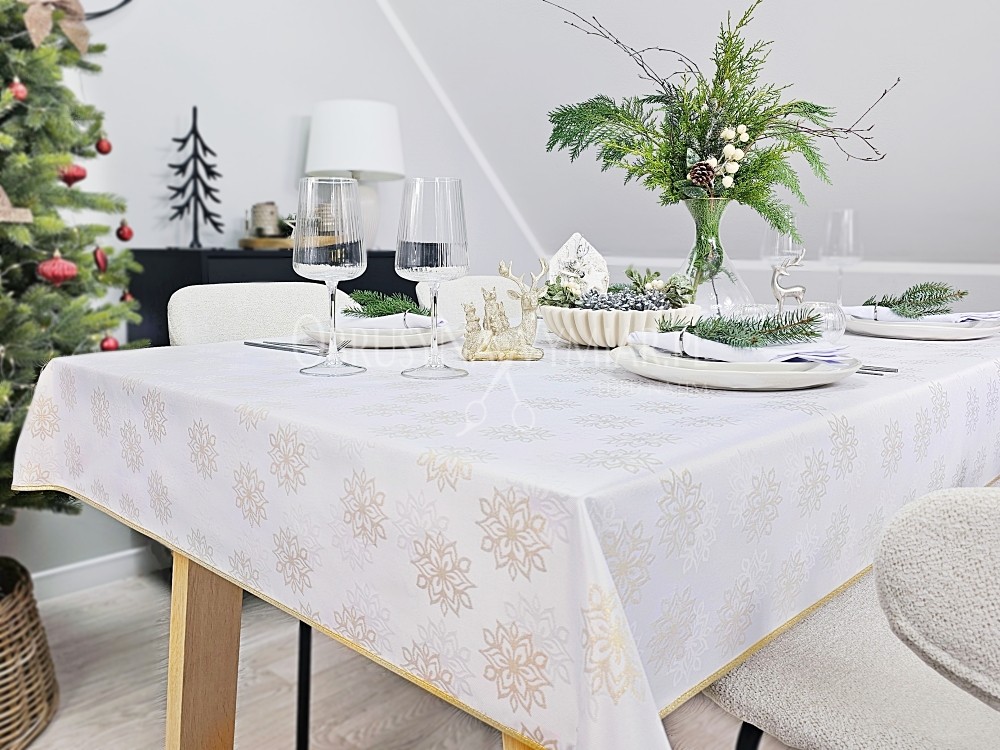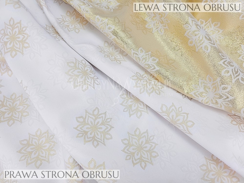 Wytworny obrus o ponadczasowym wzorze rozety to kwintesencja elegancji i świątecznego blasku. Tkanina zachwyca subtelnym połyskiem oraz starannie wykonanym motywem przypominającym gwiazdę, który pięknie odbija światło i nadaje wnętrzu wyjątkowego charakteru.